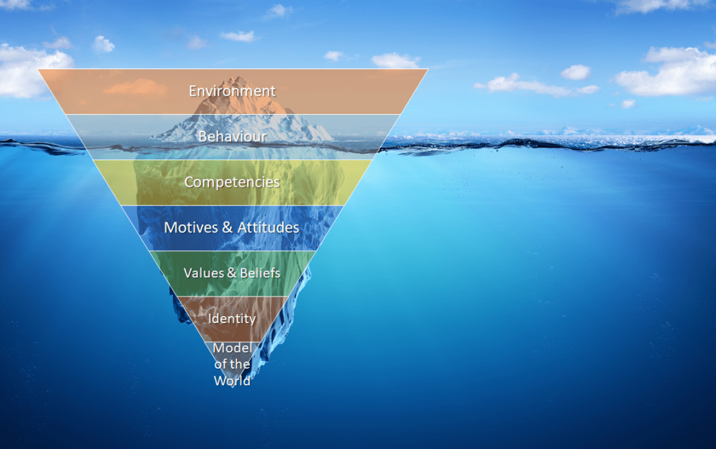 E.g. an angry behaviour in a high stakes meeting (that show above the waterline like the tip of the iceberg – behaviour and environment) can bring about many assumptions and theories of that person (that are hidden below the waterline and forms the bigger part of the iceberg) in particular without truly knowing that person.