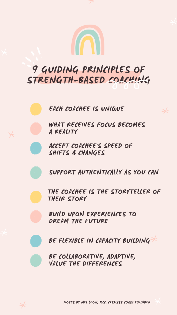 I love the 9 guiding principles of strength-based coaching from Coach Mel Leow, MCC, Catalyst Coach Founder. Essentially, the principles are focused on developing potential, rather than fixing problems, which is part of the Connect Phase, in the FLOW5 C.O.A.C.H. Process.