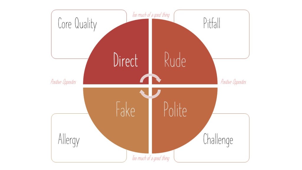 The client’s core quality is directness, ability to be authentic, frank and open to share. Too much of this, will make her seem rude, transparent, and even unfiltered, probably leading to trust issues. If apply Ofman’s learnings, is how can she balance her core quality with her challenge quadrant, i.e. being polite. Perhaps, her coach will need to facilitate her potential to balance direct feedback with some positive language and effective communications. Too much of it, could lead to the client feeling that she is not being her true self.