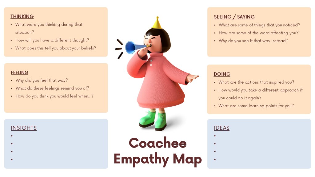 How can a coach the client / coachee honour their learning, and eventually honouring the coachee? A useful self-reflection tool would be the Empathy Map, helping the client / coachee to assess their thoughts, emotions and actions are congruent with their experience, identify insights and generating ideas in the process. In using the empathy map, remember to celebrate positive changes, encourage milestones and acknowledge effort. After all, sometimes not all successes are immediate. Recognize that efforts, and actions are equally important as those big / small wins.